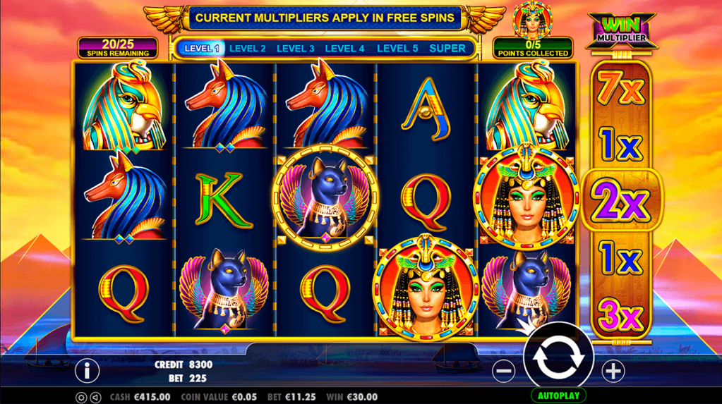 Selama permainan progresif, Anda juga akan mengumpulkan poin dengan memilih sel di gulungan dan menekan simbol Cleopatra di ruang yang dipilih. Anda dapat melihat tempat yang Anda pilih saat ini, karena memiliki cincin emas di sekelilingnya. Anda mendapatkan satu poin per pukulan, dan Anda harus mengumpulkan lima poin dalam 25 putaran atau menekan simbol joker di gulungan keenam untuk maju ke level berikutnya.